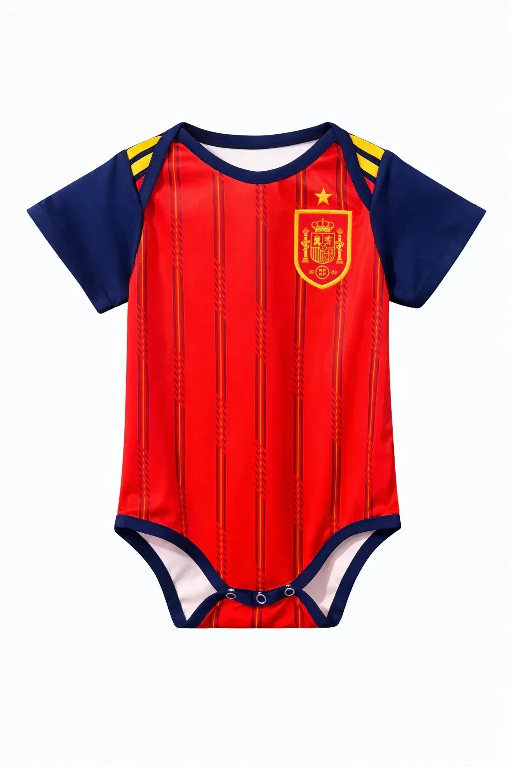 This baby football kit features Spain's iconic red colors and national crest, making it an essential piece for any baby fan.