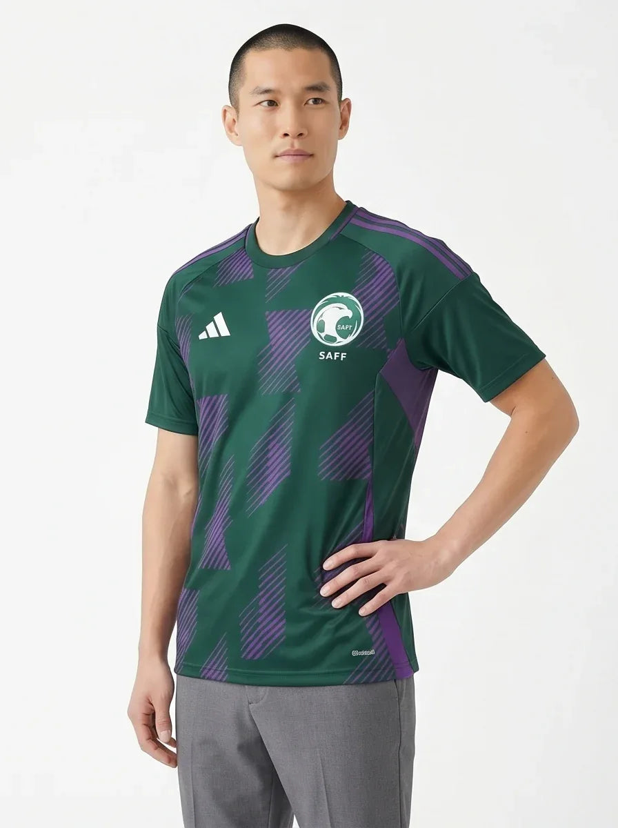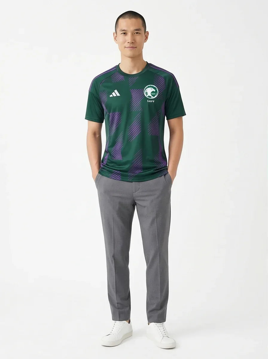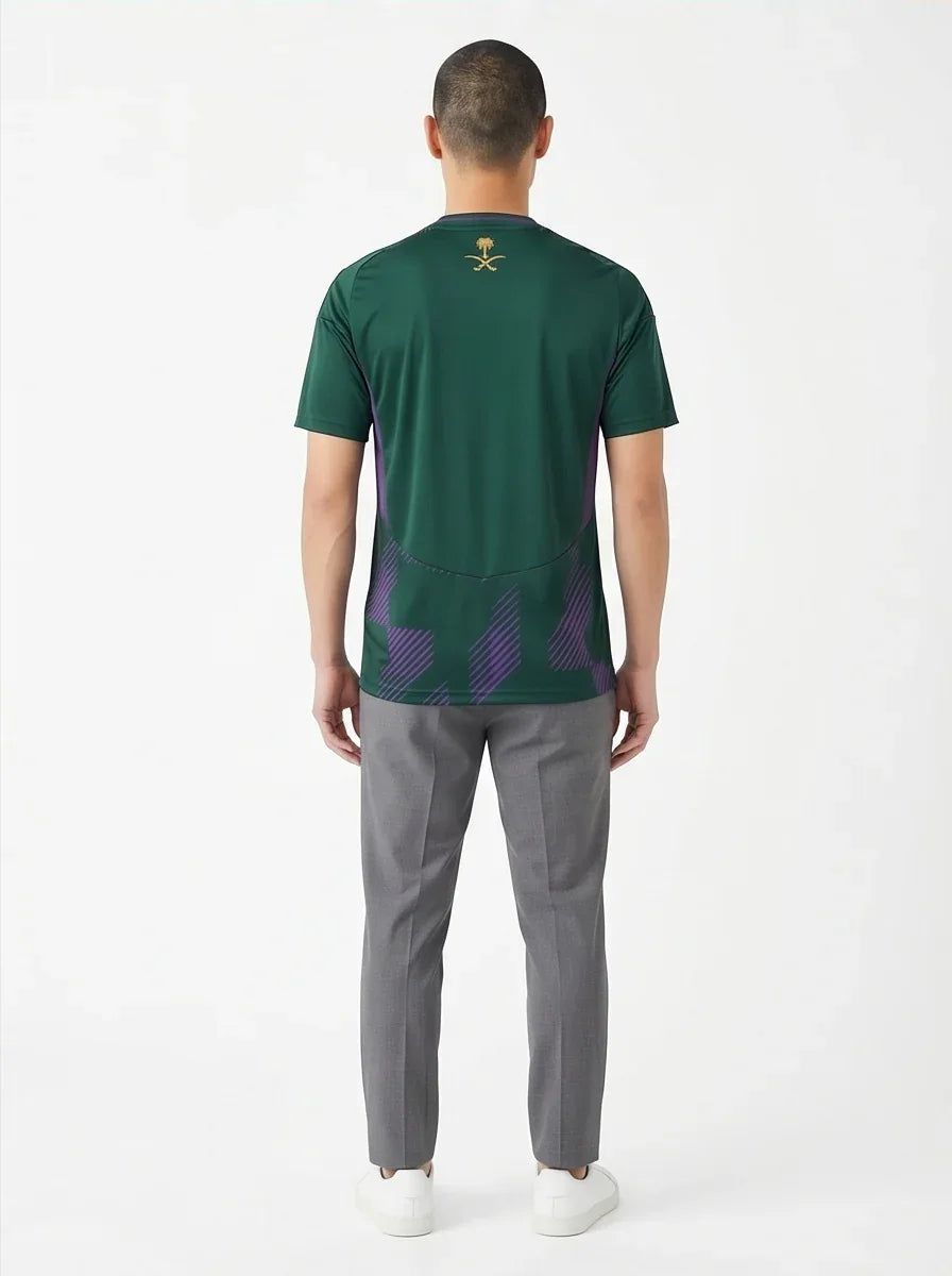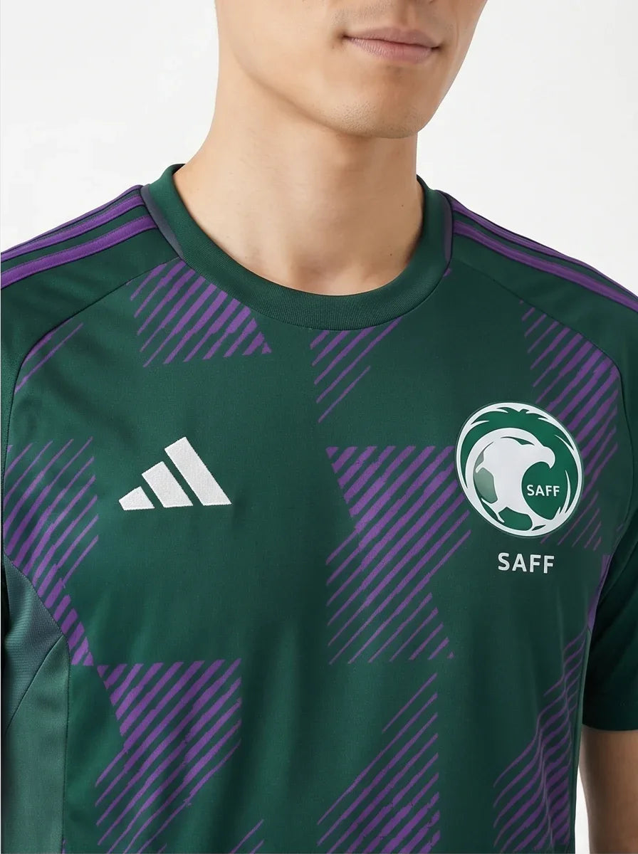 This national team jersey features Saudi Arabia's iconic green and white colors and official national crest, making it an essential piece for any fan.